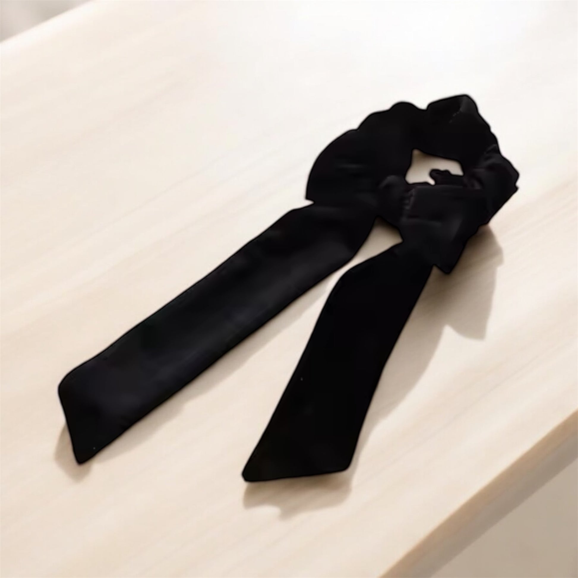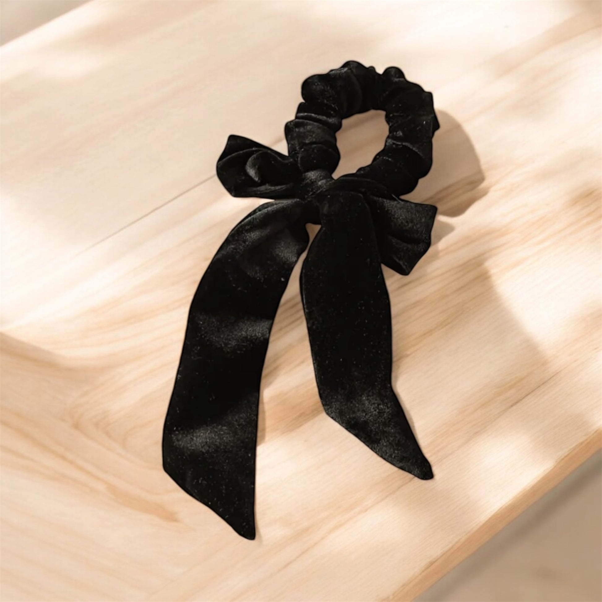 Velvet Black Scrunchie with Long Bow: Elegant & Sophisticated Hair Accessory